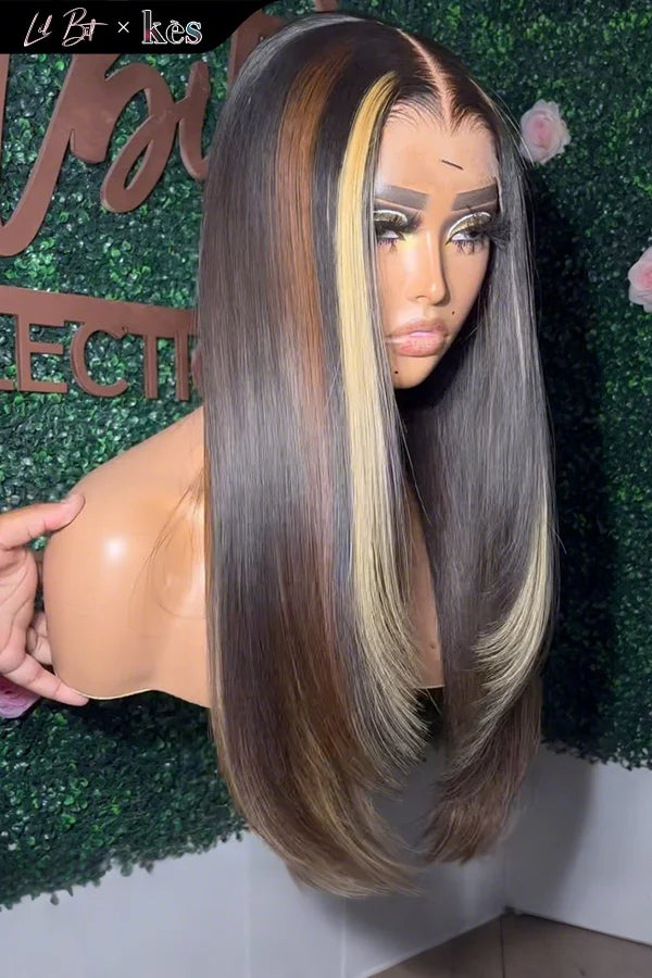Kes x lilbit_collections 18 inch 5x5 Glueless human hair HD lace closure wigs 200% density straight wigs brown and blonde highlight color