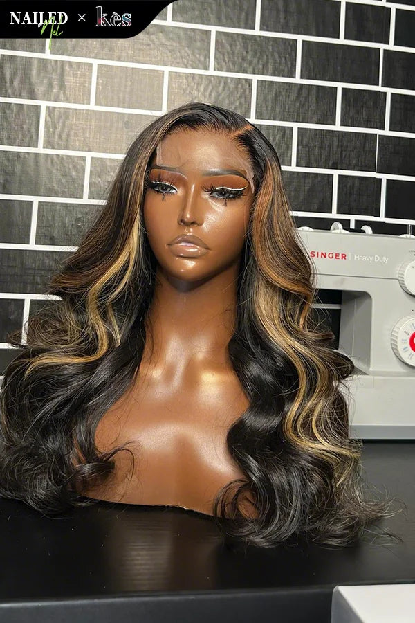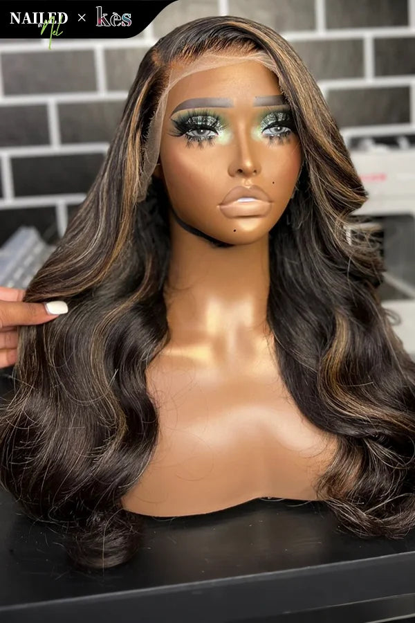 Kes x nailedby.nel 22 inch 5x5 Glueless human hair HD lace closure wigs 200% density body wave wigs brown highlight