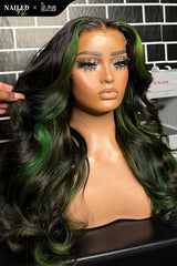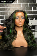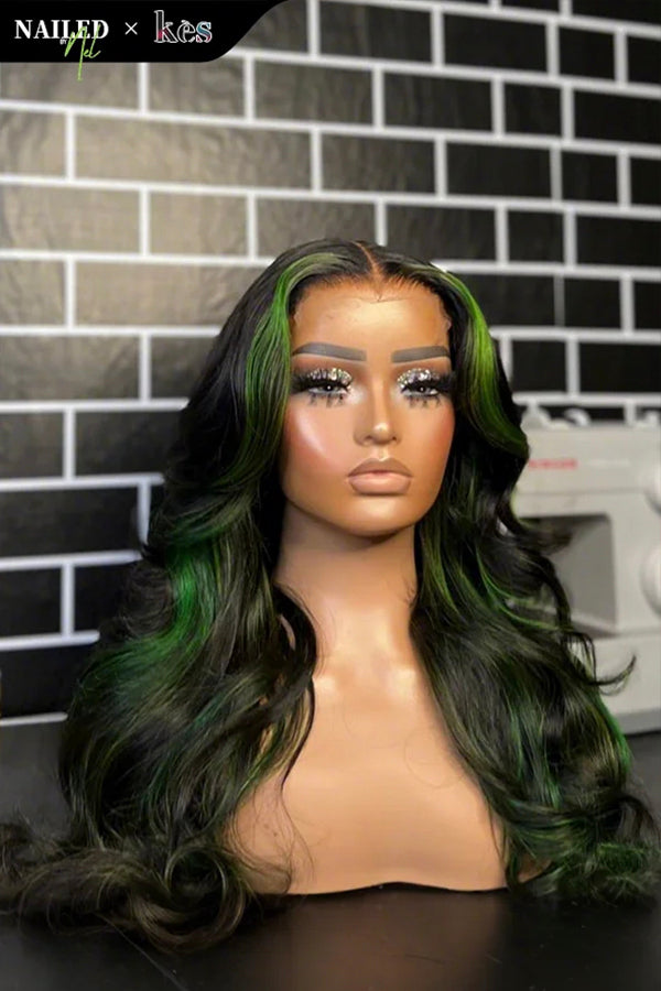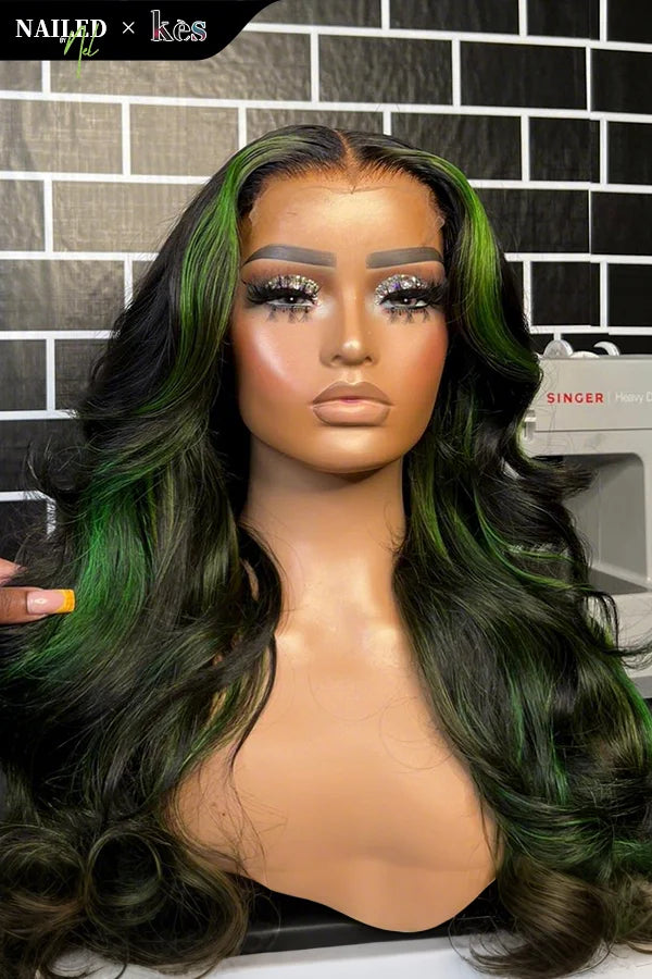 Kes x nailedby.nel 22 inch 5x5 Glueless human hair HD lace closure wigs 200% density body wave wigs green highlight color